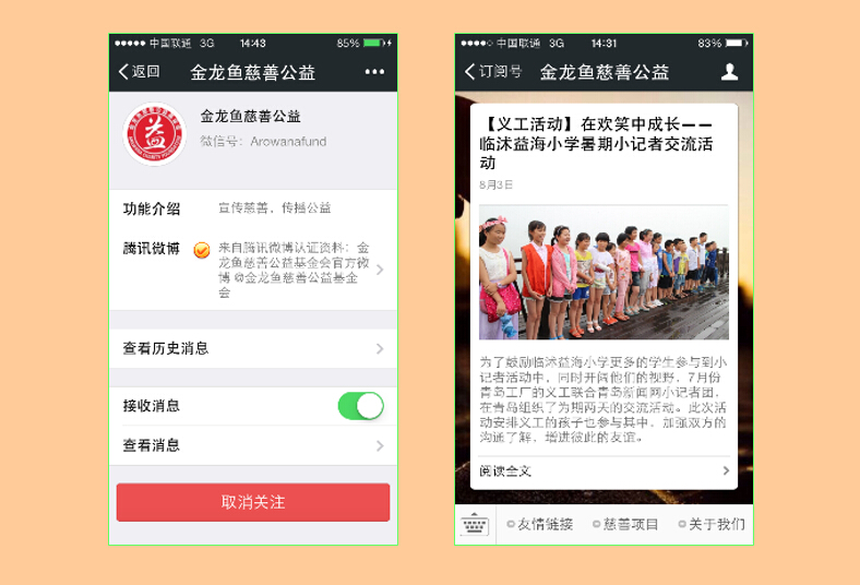 金龙鱼基金会的成立标志着益海嘉里的慈善公益事业步入一个新的时代,为了让更多的员工了解并加入的义工队伍中,积极参与慈善公益活动,搭建慈善公益交流的平台,调动更多的爱心人士和资源推动慈善公益事业的发展,金龙鱼慈善公益微信公众平台应运而生。
